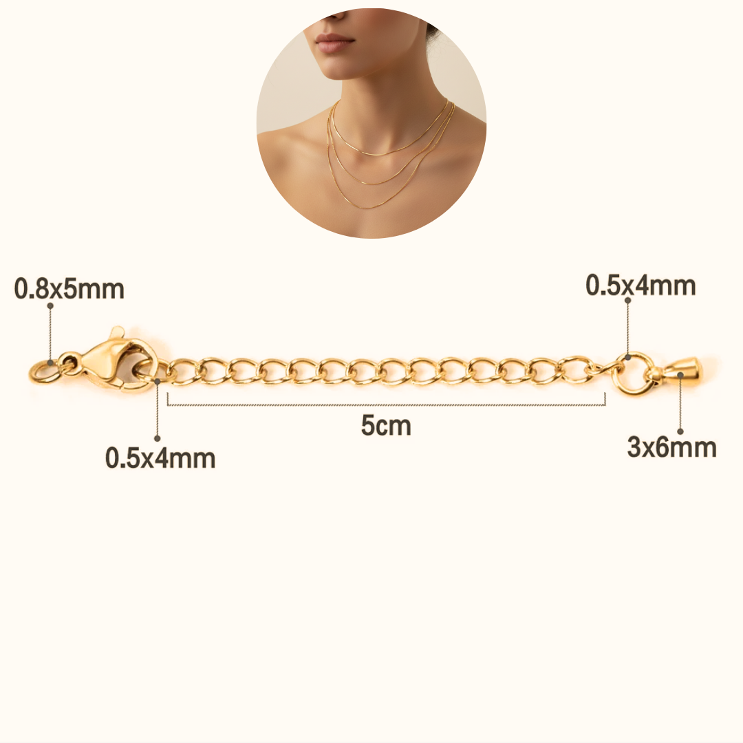 Non rinunciare ai tuoi gioielli preferiti: personalizzali." Hai una collana troppo corta o vuoi creare l'effetto layering perfetto? L'extender Perfect Fit è l'accessorio indispensabile per trasformare i tuoi gioielli. In pochi secondi, aggiunge 5 cm di lunghezza extra a qualsiasi collana o bracciale.
