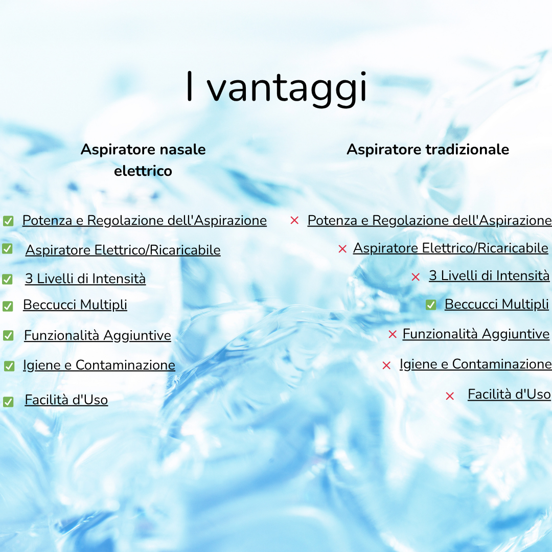 Perché accontentarsi? Scegli l'innovazione che ti cambia la vita. Il nostro dispositivo è progettato per darti la massima efficacia nel liberare il naso del tuo piccolo, con la minima fatica. Più potente, più igienico, più facile da usare. La soluzione che stavi cercando è qui!